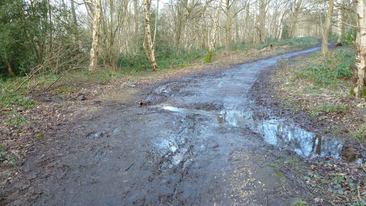 through the pipe and the pond had gone in a matter of minutes. Your correspondent estimates that at least 500 gallons of water were trapped across the path until the pipe was cleared. Once the pond had gone, it became clear that a stream was running down the hill and across the path and it continued to flow strongly through the drainage pipe.