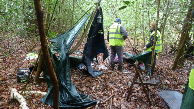 After an intensive search for the charity bags we were unable to find them, so it seems likely that someone else has removed them from the woods. However we were able to find the abandoned tent which was in shreds.