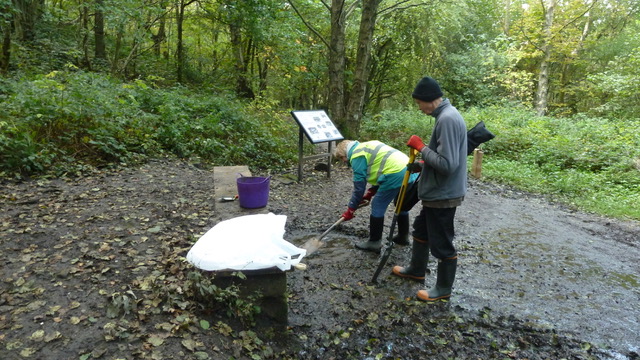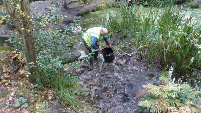 As usual we found plenty of very large logs and stones and removed them before embarking on the task of removing buckets of silt. Usually we have quite a large team, but today we started with two of us in the pond filling the buckets and two of us transporting the buckets of mud away for tipping down the nearby bank.
