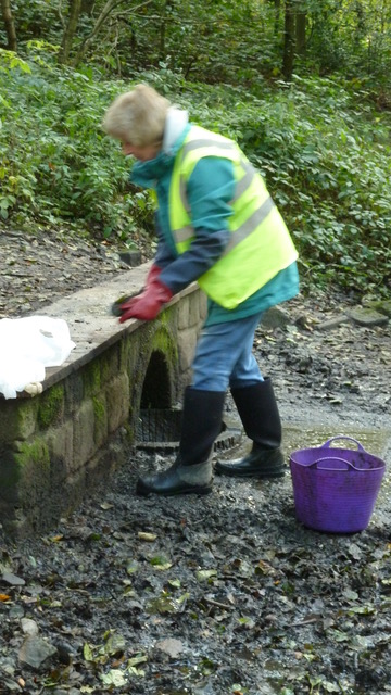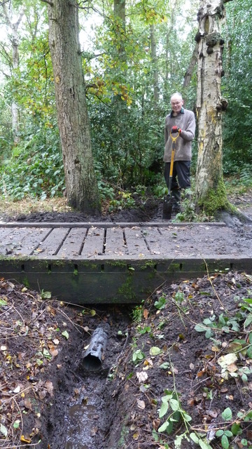 After about an hour, David set off to clear one of the ditches feeding the pond. Last year we cleared the ditch and inserted a pipe under the bridge leading down from the Meanwood Valley Trail but we were surprised to find a fortnight ago that the pipe was no longer visible as mud now covered it and completely blocked the space under the bridge. David came armed with his drainage rods as well as a couple of spades specifically to rectify the situation.
