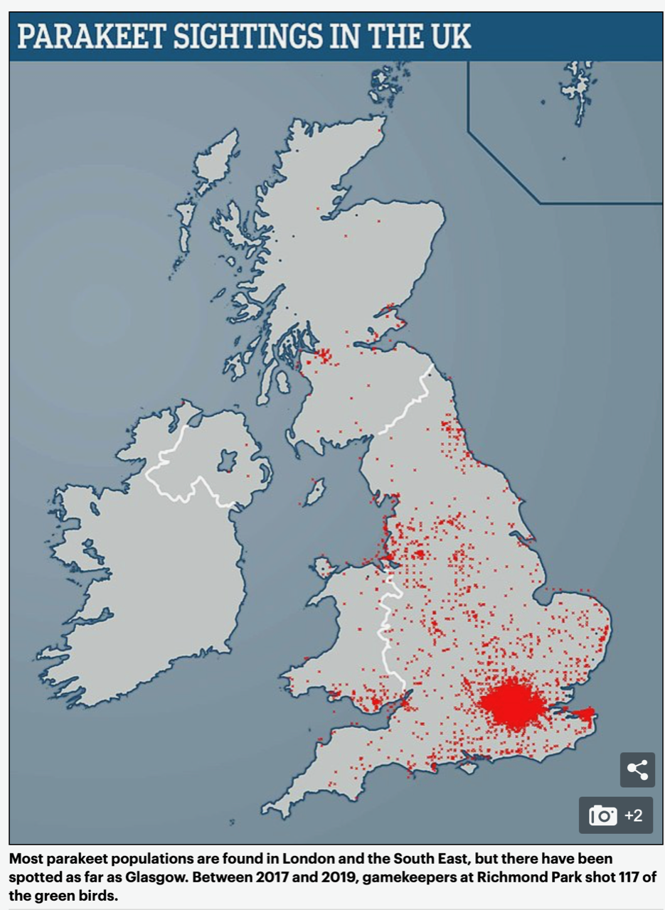 The reason that Ring Necked Parakeets have been in the news is that they have become so numerous in the London area that some people are calling for a cull as they are an invasive species and they are allegedly causing problems for farmers and native species.