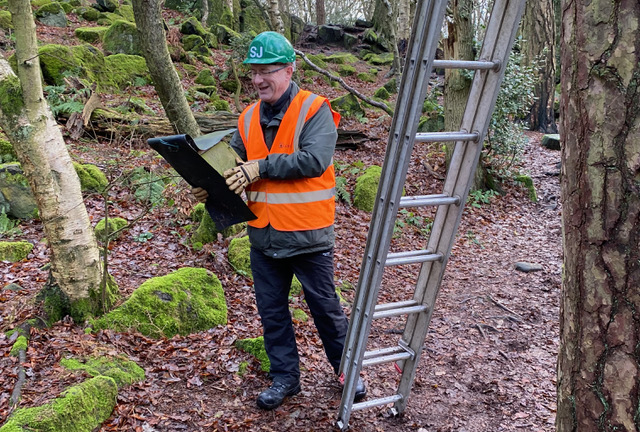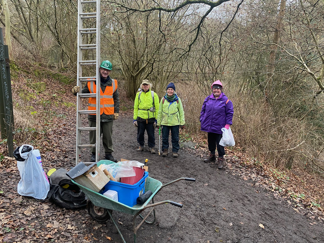 Having cleaned nest box 35 we made our way down the Meanwood Valley Trail to the Seven Arches, cleaning another fourteen nest boxes, finishing with box 39, to the right of the path. We then put up nearby two more nest boxes donated by Rob and Tina, having numbered them 50 and 51.