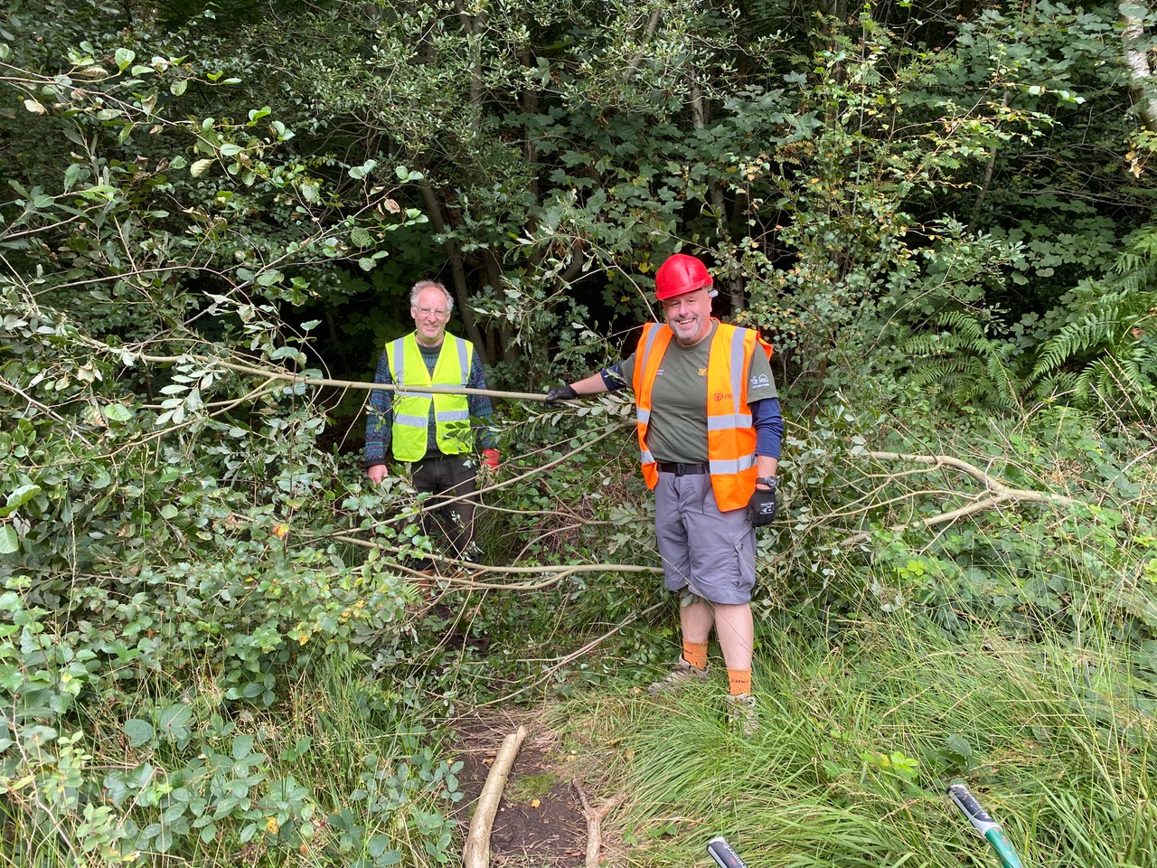 While David led the construction of the dead hedge, the rest of us provided materials by pulling up saplings with “tree poppers” (wonderful tools which can pull up a small sapling in a matter of seconds), clearing brambles, and cutting back branches on the trees around the edge of the bog.