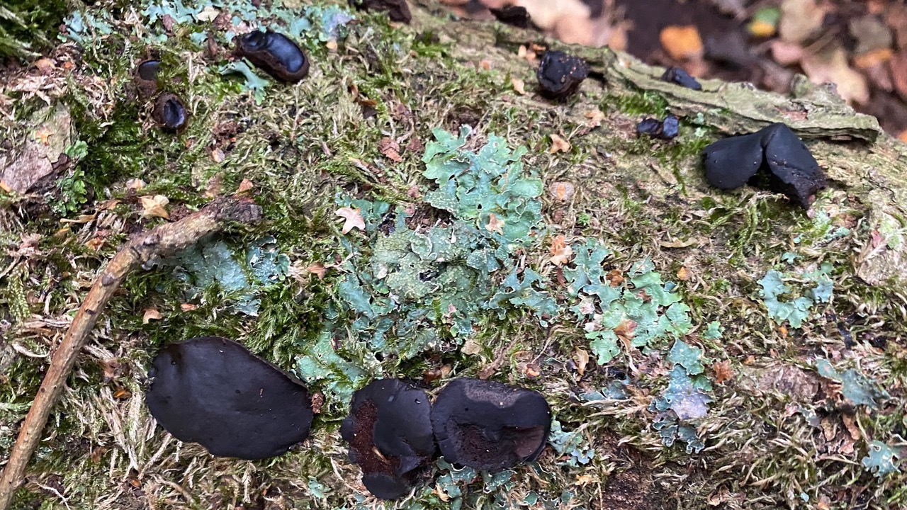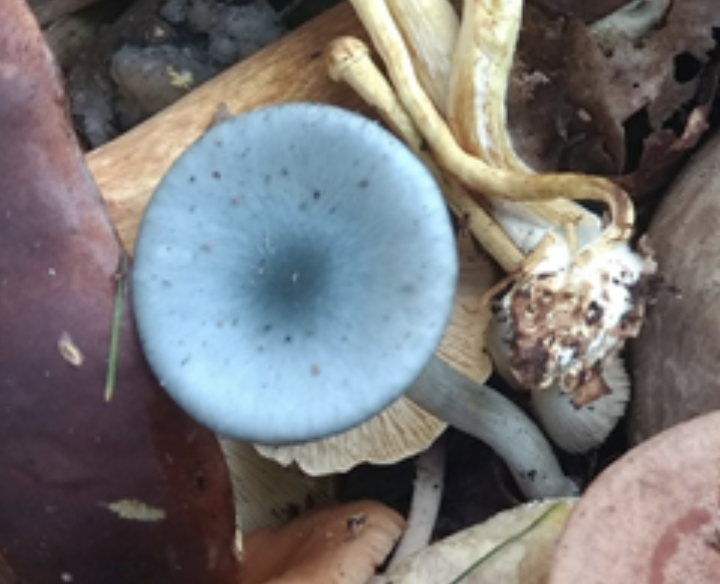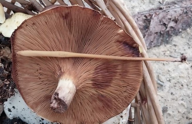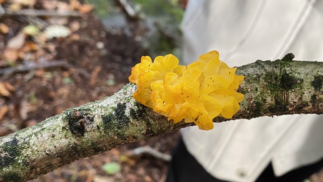 Steve’s basket at the end of the forayTripe fungus (Auricularia mesenterica)Ochre brittle gill (Russula ochroleuca)Blushing bracket (Daedaleopsis confragosa)Tawny grisette (Amanita fulva)Black bulgar (Neobulgaria pura)Butter cap (Collybia butyracea)Shaggy scalycap (Pholiota squarrosa)Milkcap – precise species uncertain. These owe their name to the latex they produce when cut or bruisedRufous milkcap (Lactarius rufus)Southern bracket (Ganoderma adspersum)Yellow stagshorn (Calocera viscosa)