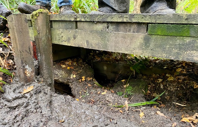 Today Steve Joul and the chair of Friends of Adel Woods met with members of the Parks and Countryside department of Leeds City Council to ascertain what work needs to be carried out to repair the pond and to improve it. We were able to establish that water was not actually leaking through the sluice gate but flowing out through the clay below or to the side of the gate. It is possible that the leak has been caused by tree roots.