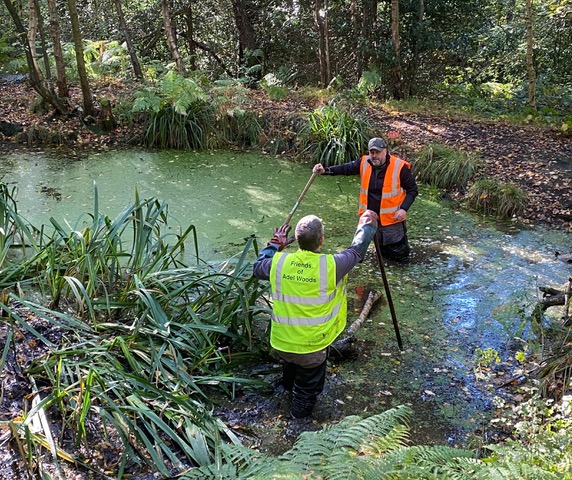 There were three aspects to our work on the pond. Firstly, to remove small trees and overhanging branches from around the edge of the pond, in order to let more light in and to reduce the number of leaves falling into the pond.